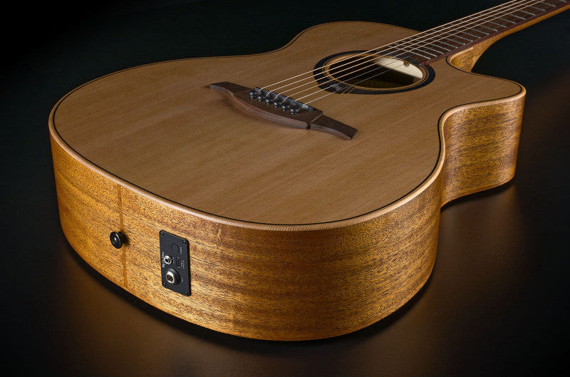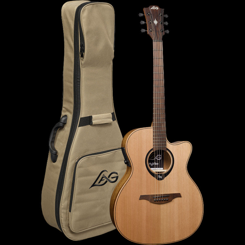 Comfortable and elegant, this auditorium model offers warm, punchy, and balanced tone from the solid cedar top, and exceptional sound quality with the innovative HyVibe H2 system.